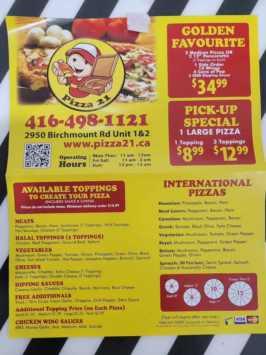 Welcome to Pizza 21, an exceptional pizza destination nestled at 2950 Birchmount Rd in Toronto. This spot has quickly become a favorite among locals for its outstanding flavor and value. What sets Pizza 21 apart are its generous portions and commitment to quality. Customers rave about the unique blend of flavors in their pizzas, as well as their signature dish: the Panzerotti, which is generously loaded with toppings.